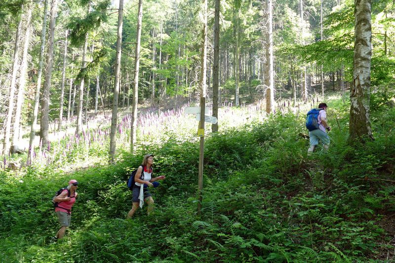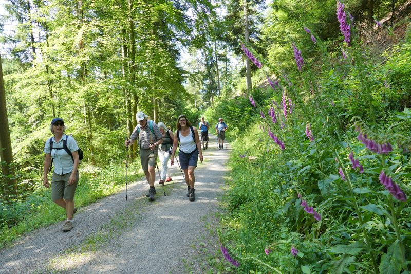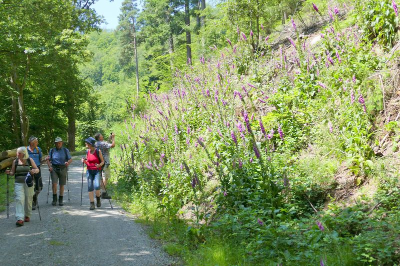 Fazit: Ein wunderschöner Weg an vielen blühenden Fingerhut-Ansammlungen vorbei mit fantastischen Ausblicken ins Tal bis über den Rhein, aber die tropischen Temperaturen brachten uns an die Grenze unserer Leistungsfähigkeit.
