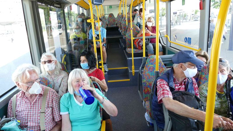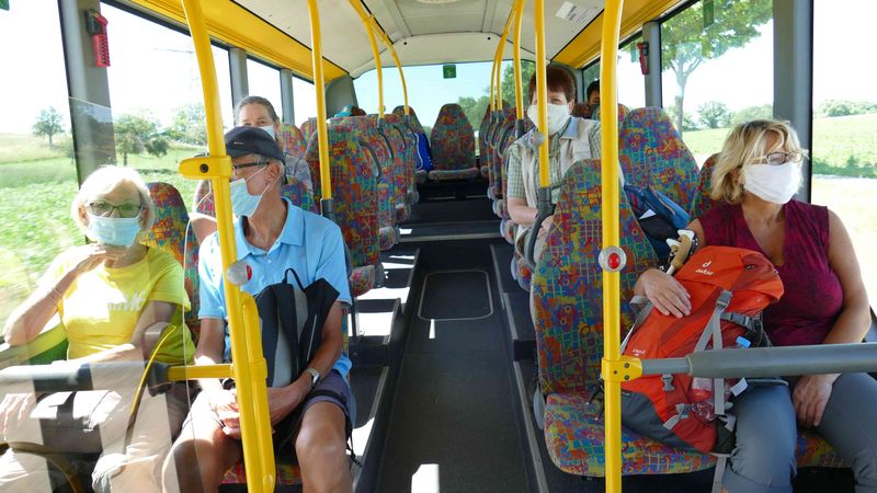 „Maultäschle“-Maskenpflicht in Bussen und Bahnen, Mindestabstände und maximale Gruppengrößen von 10 Personen im öffentlichen Raum – so waren die Vorgaben für unsere erste Wanderung auf dem Waldenser- und Hugenottenpfad. 17 Anmeldungen- da machte Rainer eine eigene Gruppe auf, und es passte. Er startete maskiert gegen halb zehn in Nagold mit dem Zug nach Pforzheim, in Wildberg stieg auch die andere Gruppe in den Zug. Ab Pforzheim fuhren beide Gruppen mit dem Bus nach Kleinvillars. Aufgrund der Kleingruppen unter 10 Personen war keine Anmeldung erforderlich.