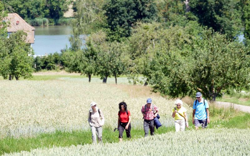 Kleinvillars ist eine Neugründung der aus Glaubensgründen geflohenen Waldenser in 1699 mit ca. 100 Personen. Von dort führt der Weg zum Aalkistensee. Er wurde im 12./13. Jahrhundert von den Zisterziensermönchen in Maulbronn angelegt. Nach 1 ½ Stunden erreichten wir auf schönen Waldwegen den Aussichtspunkt Eichberg zur gemeinsamen Mittagspause, Corona-bedingt mit Abstand verteilt auf Himmelsliege, Bänken und Schutzhütte.