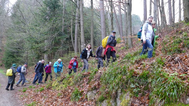 Die Märzwanderung fand im Murgtal statt. Die Bahn brachte uns von Hochdorf nach Hilpertsau. Auf dem „Kunstweg am Reichenbach“ folgten wir dem gleichnamigen Bach auf bequemem Weg aufwärts bis zum Kriegerdenkmal eingangs Reichental. Der Bach, die Felsen, die Wiesen mit den typischen Heuhütten und die Flora und Fauna im Frühlingskleid boten eine malerische Kulisse für die mehr als 40 Kunstwerke, die auch teilweise in den Heuhütten untergebracht sind. Vom Kriegerdenkmal aus wurde der breite Weg zum steilen Pfad. An der Fatima-Kapelle stärkten wir uns am mitgebrachten Vesper, und auf der ausgeschilderten Murgleiter gingen wir hoch zum Rockertfelsen bis kurz vor Obertsrot. Leider gerieten wir in Nebel und Regen, sodass wir von oben den Ausblick übers Tal bis zum Merkur nur erahnen konnten. Beim Abstieg ließen Regen und Nebel nach, und wir konnten uns an den Frühlingsblühern erfreuen. Mit der Murgtal-Bahn fuhren wir zurück bis Baiersbronn, machten unsere obligatorische Schlusseinkehr in der „Mühlbachstube“ direkt am Bahnhof und fuhren nach 1 ½ Stunden weiter nach Hochdorf.