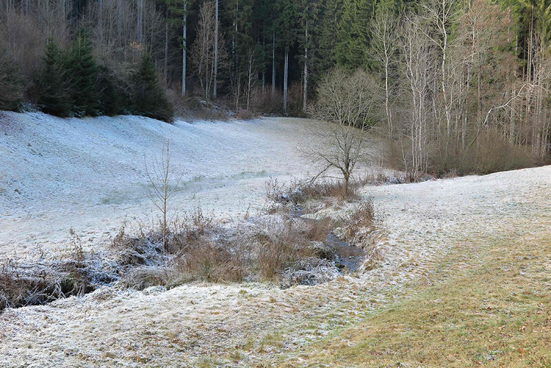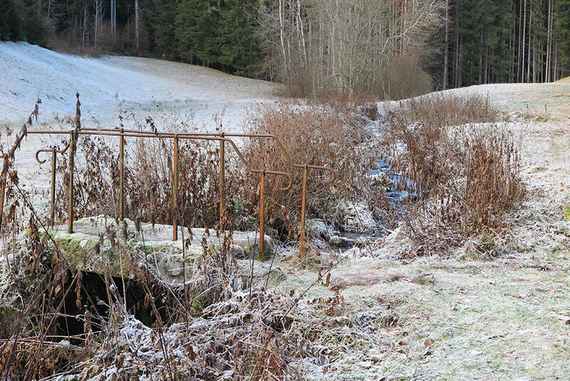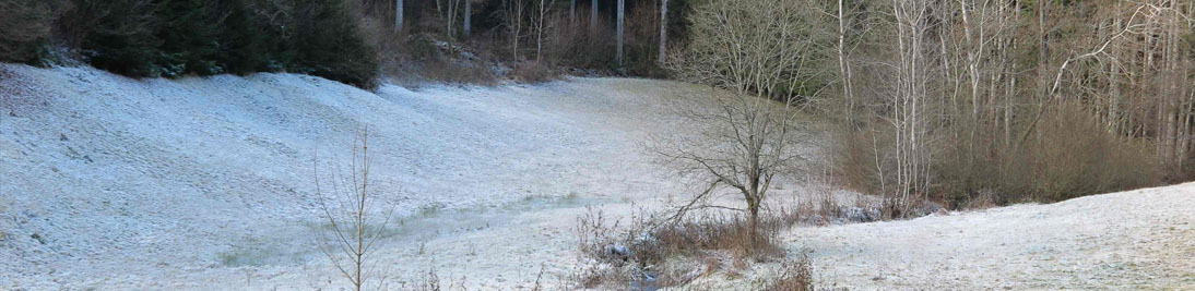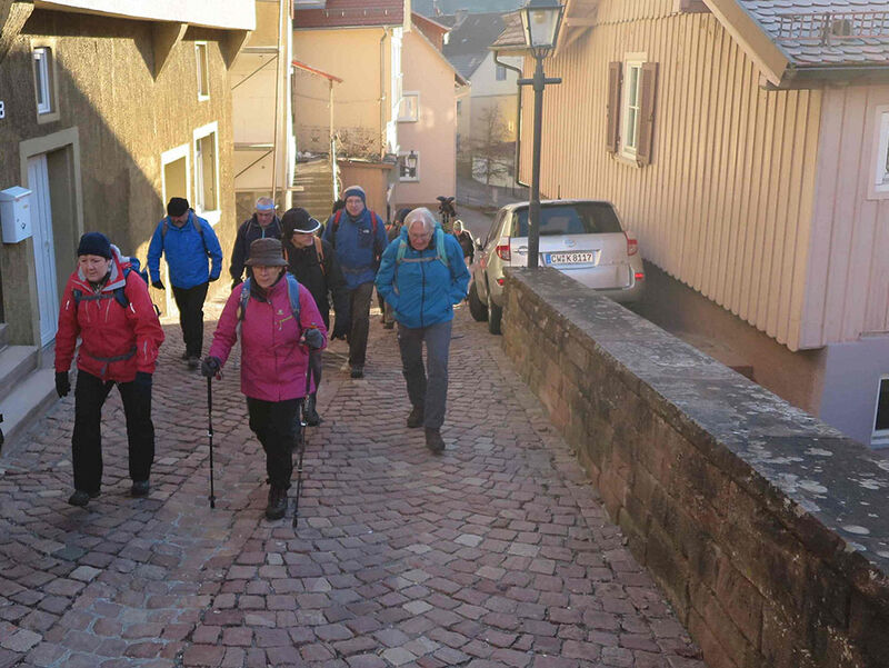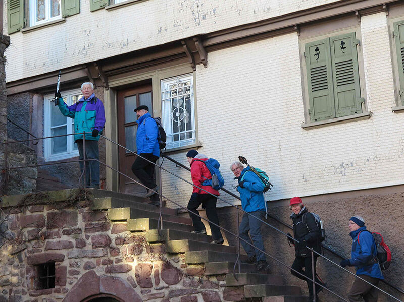 Um 9.30 trafen wir uns bei frostigen Temperaturen auf dem schattigen Parkplatz am Gasthof Traube in Altensteig. Von dort gelangten wir beim Aufstieg durch die Oberstadt zum Schloss bald in die Sonne, und die Reißverschlüsse der Winterjacken konnten schon ein Stück geöffnet werden. Im schönen Schlosshof schauten wir uns nochmal um und gingen wir an den Weihnachtsmarkt-Hütten vorbei weiter Richtung Altensteigdorf. Auf dem Kirchweg Richtung Überberg mussten wir wegen der aufgegrabenen Straße die Baustelle durchklettern. Aber das war kein Problem, bei den letzten Wanderungen waren Brücken ja auch im Abbruch oder fehlten sogar ganz. Im Wald vor Ettmannsweiler behagte uns wieder unsere Winterkleidung, aber die Sonne wärmt doch schöner. Steil abwärts gings ins reifbedeckte Köllbachtal über den Köllbachsteg. Aufwärts zur Hornberger Höhe wurde uns auch ohne dicke Jacken warm. Oben am „Augenblick Hornberg“ genossen wir den weiten Ausblick in der Wintersonne unter stahlblauem Himmel während der Mittagspause, bevor wir entlang der Waldhufen durch Hornberg zur Besichtigung des Waldschulheims Hornberg gingen.