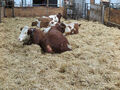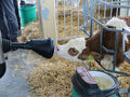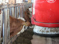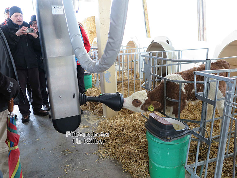 Wir trafen Bauer Friedrich Bürkle bei den Kälbern an. Sie wohnen auf Stroh in Kälberiglus, regelmäßig kommt der Fütter-Roboter an dem Gitter vorbei, hält an, und die Kälber können 40 Grad warme Mich aus dem Nuckelsauger absaugen. Trinken sie eine bestimmte Zeit nichts, fährt der Roboter weiter zum nächsten Kalb.