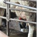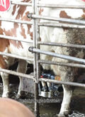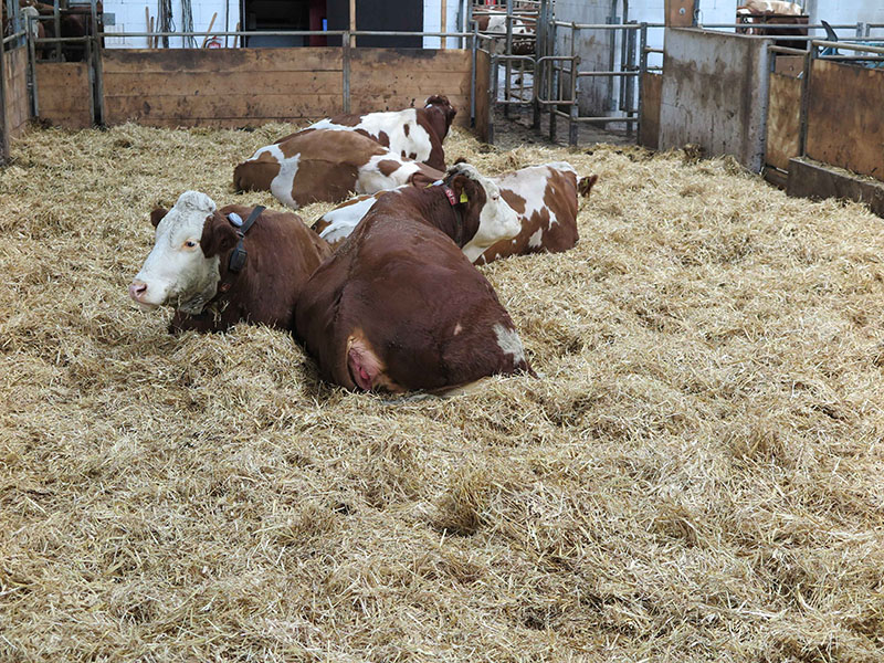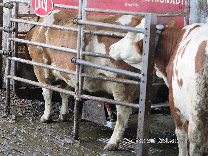 Vieles erfuhren wir noch, bevor wir dann in den Milchvieh-Laufstall gingen. Die Kühe laufen frei herum, ein Futter-Roboter verteilt regelmäßig Futter vor den Trögen. Bei Bedarf gehen die Kühe selbständig zum Melkroboter, warten auch, wenn noch eine andere Kuh darin ist. Im Melkroboter wird – mit Laser ausgemessen und computergesteuert – Euter und Zitzen gereinigt, vorgemolken in Vormelktanks und anschließend die Gebrauchsmilch abgemolken, gleichzeitig auf Menge, Fettgehalt usw. analysiert.