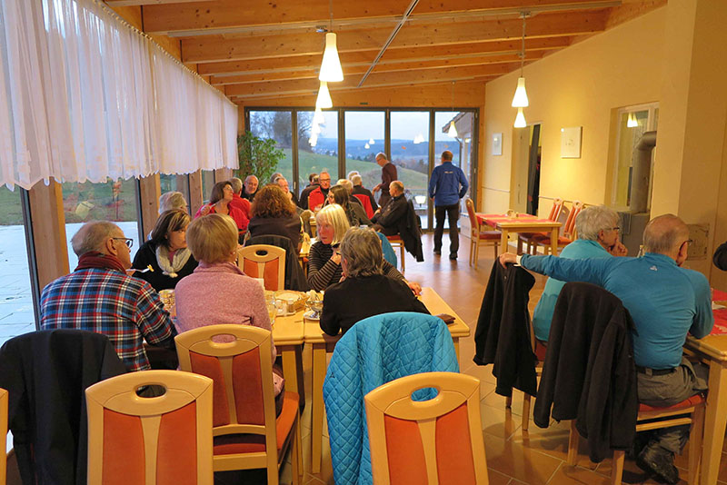 Die Sonne kam durch, und wir hatten vom Waldrand aus schöne weite Ausblicke in den weiß-verschneiten Schwarzwald. Im Wald konnten wir dann mit schönen Pfifferlingen noch einige Leckerbissen mit nach Hause nehmen. Abwärts in das Lautertal gelangten wir auf dem Gäurandweg nach Glatten und stiegen wieder auf nach Ursental zum Bürklehof. Bei der Einkehr um 15.30 im Reiterstüble auf dem Bürklehof konnte uns Herr Bürkle noch einige Fragen zu der „Infoveranstaltung“ am Vormittag beantworten.
