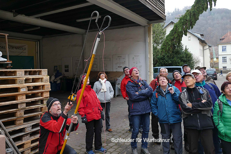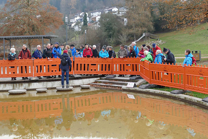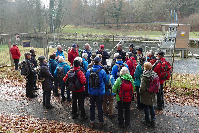 20 Personen füllten den Zug von Nagold nach Wildberg, wo dann mit den 12 Wartenden die Wandergruppe komplett war. Zunächst ging es auf schönem Pfad direkt an der Nagold entlang zur Klosteranlage. Dort gab es die erste Infoveranstaltung: Eckhard erzählte kurzweilig vom Wildberger Kloster Reuthin und vom Zweck der (Frauen-) Klöster. Dann gingen wir über den Baumlehrpfad bis zum Schwarzenbach-Tal. Kurze Mittagsrast, dann überqueren der Nagold und zum Einlasskanal des Laufwasserkraftwerk Bettenberg, wo uns Eckhardt über die Geschichte der Elektrofizierung im Nagoldtal informierte. Aufgrund der vielen Informationen unterwegs kamen wir mit 20-minütiger Verspätung um 14.50 in Nagold an der Staatsklenge an. Dort stießen wir auf 9 Personen, die nur an der Führung teilnehmen wollten.
