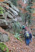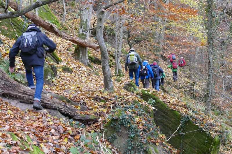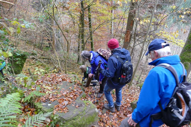 Nach Ankunft der Nagoldtalbahn starteten wir am Bahnhof Teinach / Neubulach. Durch einen schmalen Durchlass unterquerten wir die Bahnlinie und gelangten zunächst auf einen breiten Waldwirtschaftsweg. Doch schon bald waren wir froh über unsere Wanderstöcke: ein schmaler laubbedeckter Pfad führte steil aufwärts zu unserm ersten Tagesziel, dem „Dickener Schlössle“. Der Alpine Weg schlängelt sich zwischen bemoosten Felsbrocken hindurch, zwei Leitern entschärften schwierige Stellen und erinnerten uns an die Wanderwoche in der Pfalz. Angekommen am Schlössle sahen wir nichts mehr von den Ruinen, sie waren unter buntem Herbstlaub versteckt. Die Burg wurde wohl im 12. / 13. Jahrhundert von den Herren von Waldeck erbaut. Auf der gegenüberliegenden Nagoldtalseite kann man die besser erhaltene Burgruine Waldeck besichtigen. Über die weitere Geschichte des „Dickener Schlössle“ gibt es viele Spekulationen und wenige gesicherte Erkenntnisse.