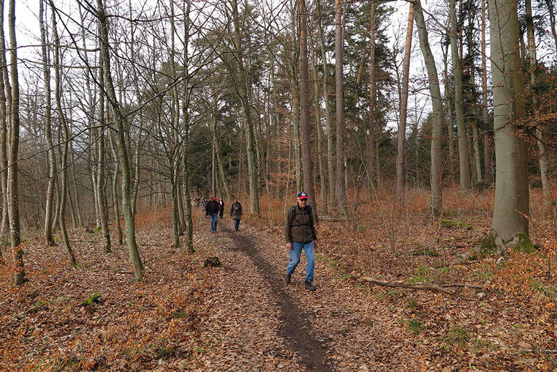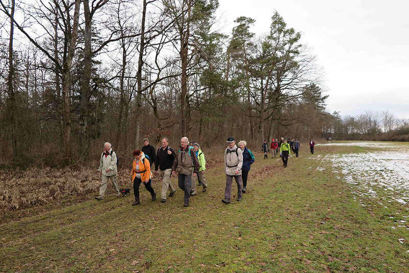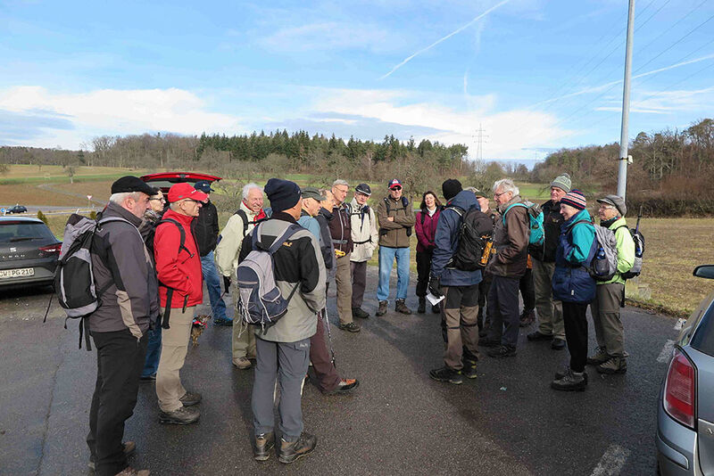 So schnell der Winter mit Schnee gekommen war, hatte ihn das Tauwetter auch wieder verschwinden lassen. So konnte eine Wanderung im Herzen des Heckengäus stattfinden. Um 11 Uhr trafen sich 23 Wanderer und ein Hund am Hengstetter Hof in Althengstett. Zunächst gab Eckhard eine kurze Erklärung über die Geschichte Althengstetts. Der Ortsteil Neuhengstett wurde 1700 von den Waldensern gegründet, protestantische Glaubensflüchtlinge aus dem Savoyen. Daran erinnern noch heute viele französisch klingende Namen in der Gegend.