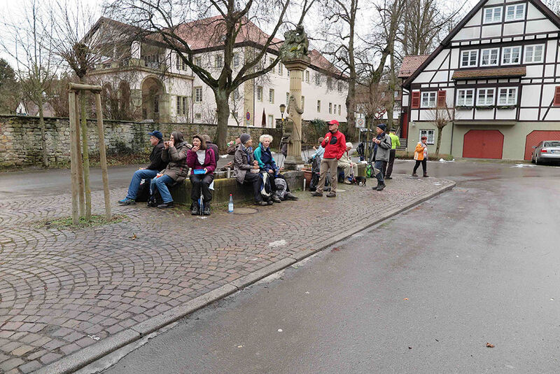 Über den Alten Ostelsheimer Weg und die Alte Ochsenstraße gelangten wir auf teilweise schönen schmalen Wanderwegen zum Predigtplatz und dann zur stillgelegten Bahnstrecke der ehemaligen Württembergischen Landesbahn. Dort soll zur Wiederinbetriebnahme der Hermann-Hesse-Bahn der Haksbergtunnel gebaut werden. Entlang der Bahnstrecke erreichten wir Dätzingen. Am Dorfbrunnen am ehemaligen Malteserschloss stärkten wir uns bei der verdienten Mittagsrast.