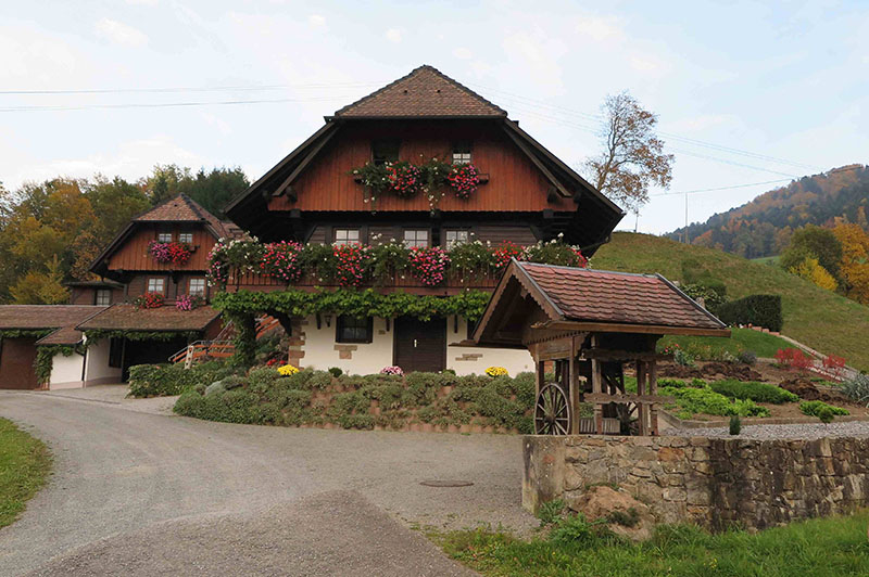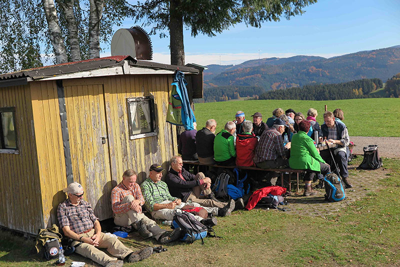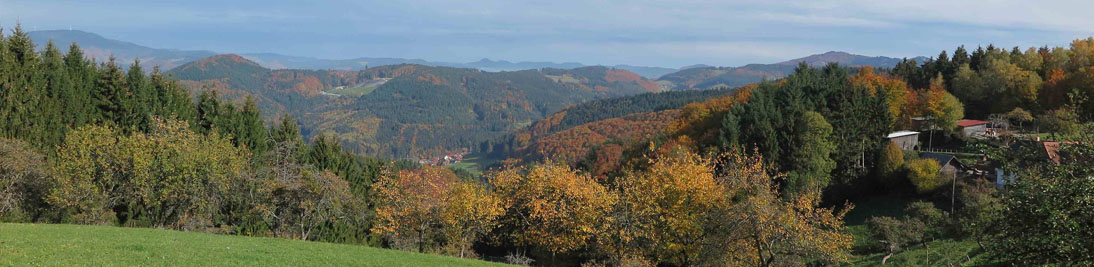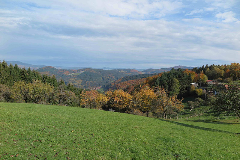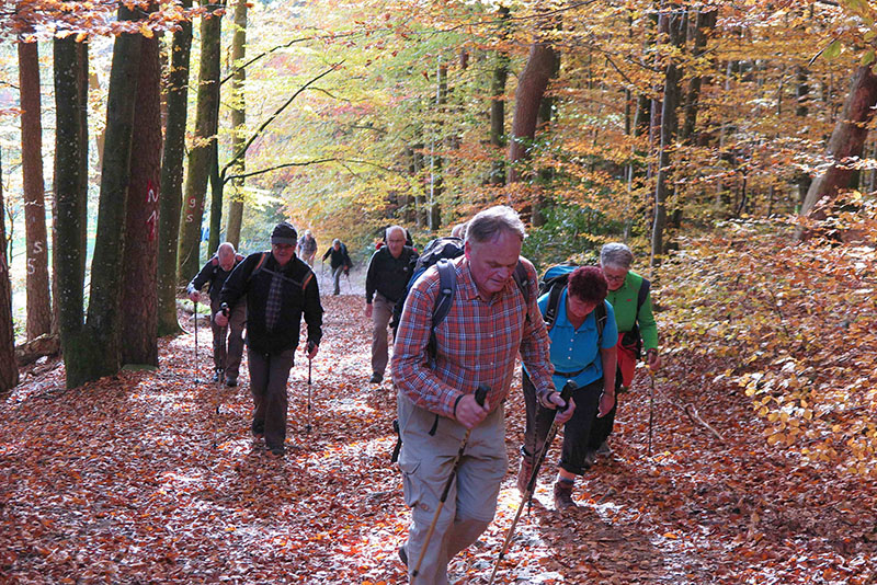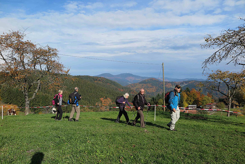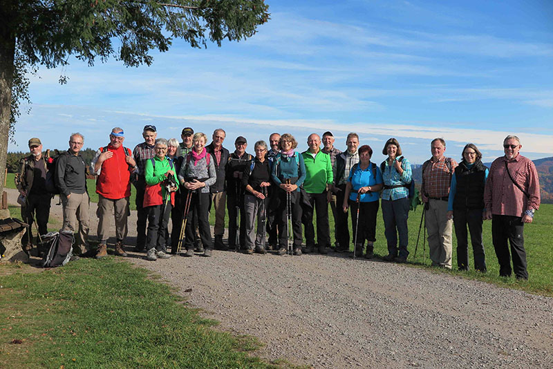 Die letzte Etappe sollte auch mit 24 Kilometern die längste sein. Eigentlich waren es ja zwei Etappen mit insgesamt 29 Kilometern, aber ich hatte etwas gekürzt. Etwas Bauchweh hatte ich schon, ob wir das auch in der kurzen Zeit schaffen würden, aber-Versuch macht klug, und zur Not konnte man ja auch noch die Bahn 2 Stunden später nehmen. Wir fuhren also wie üblich mit der Bahn ins Kinzigtal nach Haslach. Durch den Ort gingen wir zunächst auf dem ausgeschilderten Hansjakob-Weg, es gab ganz wenige Regentropfen. Dann kam die erste Abkürzung: auf einem kaum erkennbaren Steig, dem Flachenberger Weg, kam der Kreislauf bei dem steilen Anstieg so richtig in Schwung. Am Bannstein waren wir wieder auf ebenerem markiertem Weg, und bald kamen wir aus dem Wald und die Sonne aus dem Nebel heraus. Eine herrliche bunte Herbstlandschaft mit Weitblicken zum Brandenkopf bis zum Rohrhardsberg, besser hätten wir es mit dem Wetter gar nicht treffen können. Die Mittagspause in der warmen Herbstsonne an der Hütte des Modellflugvereins auf dem Flachenberg war mit einer halben Stunde leider viel zu kurz, aber wir mussten ja weiter. Heidburg, Biereck, steiler Anstieg zum höchsten Punkt am Alemanorum und in ständigem Auf und Ab übers Hesseneck zum Fehrenbacher Kreuz zum Abstieg nach Steinach. Dort kamen wir um 17 Uhr an, eine halbe Stunde später als erhofft. Aber das eingespielte Team vom Metzgerei-Gasthof Rose servierte die vorbestellten Speisen schnell, und so konnten wir planmäßig unseren Zug um 18.22 erreichen. 25 Kilometer bei 800 Höhenmetern hatten wir in den Beinen, und so hörte man beim Hinsetzen und Aufstehen bei vielen doch sanfte Stöhngeräusche. Aber wir hatten einen wunderschönen Tag, an den sich die 21 Teilnehmenden sicherlich noch lange erinnern werden. Einige hatten sogar den gesamten Großen Hansjakob-Weg in 5 Etappen mit 102 Kilometern und 3600 Höhenmetern mitgemacht, schöne Erinnerungen haben sich da ins Gedächtnis eingegraben.