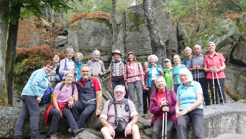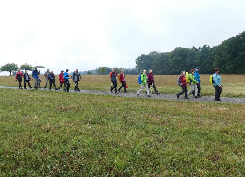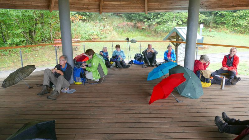 Dann begaben wir uns auf den Westweg. Vorbei am „Engen Türle“ und dem sehenswerten „Volzemer Stein“ gelangten wir zum „Dreimarkstein“. Dort mussten wir auf dem Weiterweg zur Mittagspause am Aussichtspavillon „Enzkreisspitze“ oberhalb Dennach unsere Regenschirme aufspannen. Nach der Mittagspause konnten wir die Schirme einpacken. Auf gut ausgeschildertem Weg kamen wir zur „Schwanner Warte“ – auch ohne Fernsicht – und weiter zum steilen Abstieg nach Neuenbürg um kurz vor fünf. Nach acht Minuten kam unser Zug, zunächst bis Brötzingen und dann mit der Nagoldtalbahn heim. Einige unterbrachen die Fahrt zur Schlusseinkehr im „Schönbuchbräu“ in Calw, die anderen waren um kurz vor sechs in Nagold.