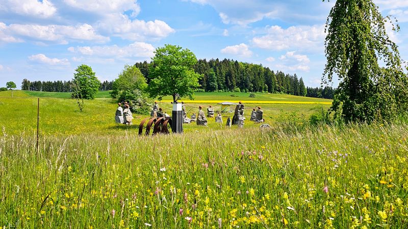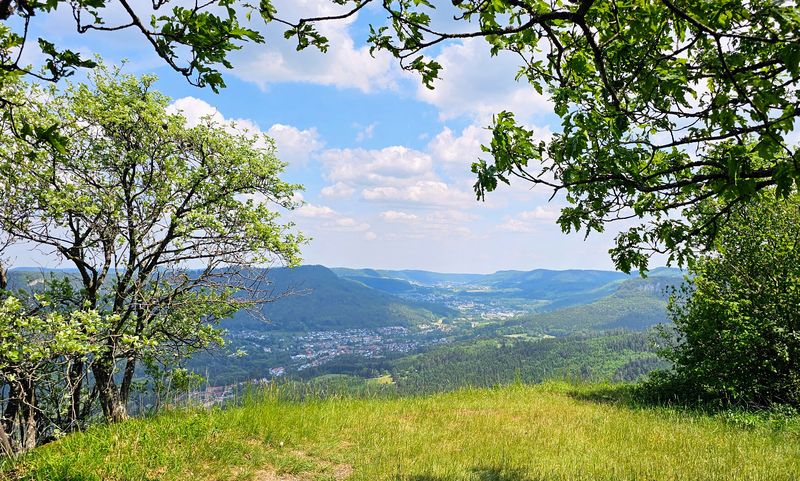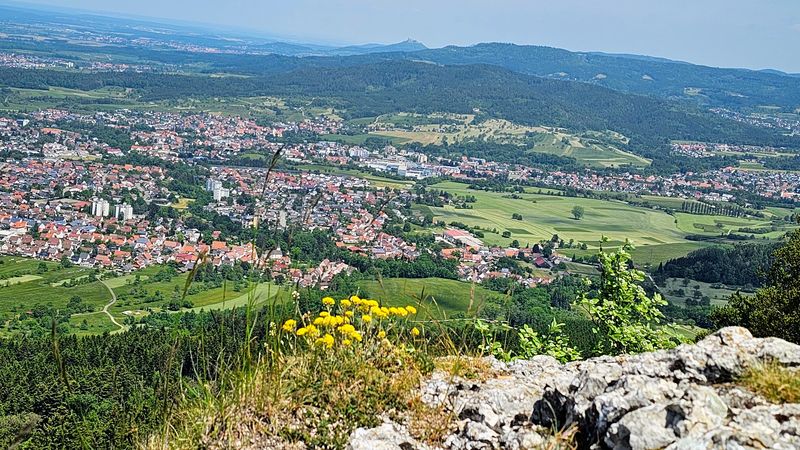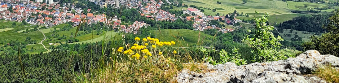 Über blühende Wiesen des Bühlen ging es hinüber auf das Hörnle (956m). Von hier boten sich schöne Aussichten über das obere Eyachtal hinüber über Albstadt.