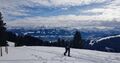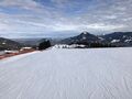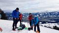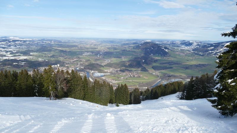 Vom Gipfel des Mittagberges gab es einen schönen Panoramablick über das grüne, schneefreie Illertal zwischen Immenstadt und Grünten. Am liebsten wären die Schneeschuhwanderer auch mit dem Schlitten ins Tal abgefahren, so wie die zahllosen Schlittenfahrer, welche mit der Bergbahn von Immenstadt hoch kamen.