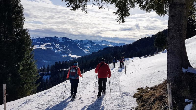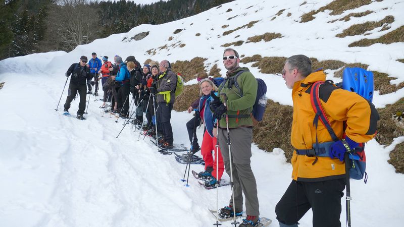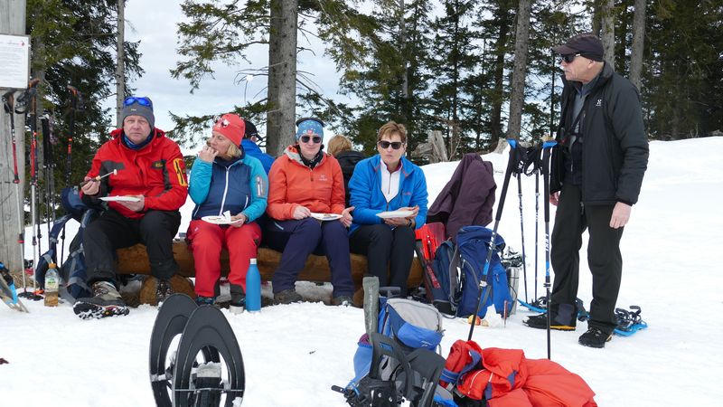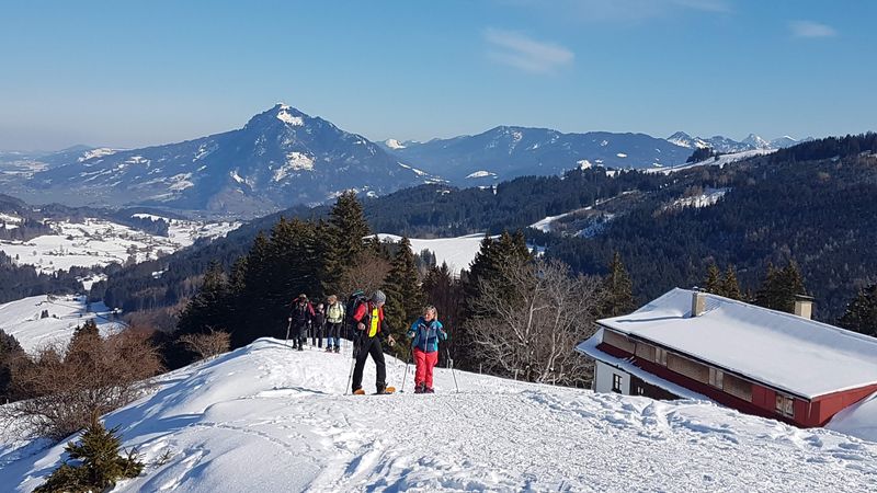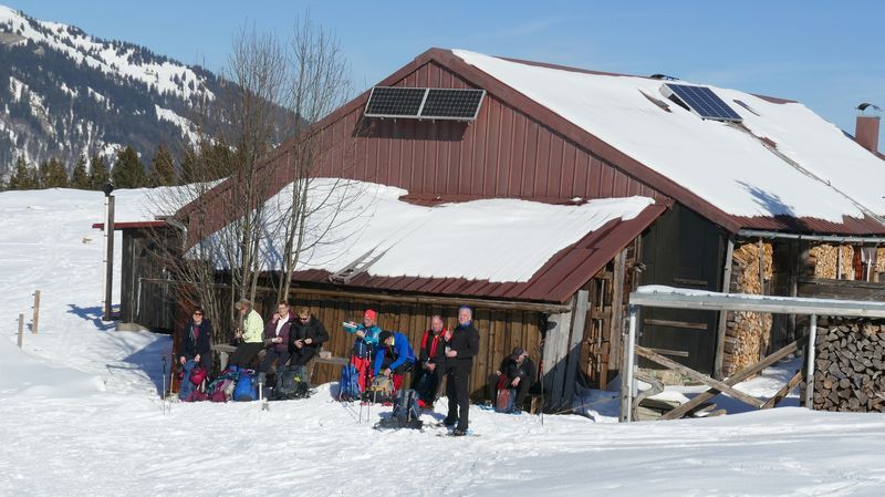 Die Eingeh-Schneeschuhtour am Freitag führte über den Höhenrücken des Ostertalberg. Nach dem steilem Aufstieg zur Mittelbergalpe ging es über den sonnigen, aussichtsreichen Höhenrücken hinüber auf den Ostertalberg. Eine Vesperpause gab es an der Birkachalpe.