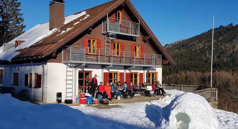Extra zum Abendessen und zur Teilnahme an der Samstags-Schneeschuhtour ist ein Teilnehmer sogar von Augsburg mit Bahn, Bus und zu Fuß an- und zurück gereist. Aber vermutlich genoss er auch, dass er mal wieder seine „Beine bei seinem Vater unter den Tisch strecken“ konnte.