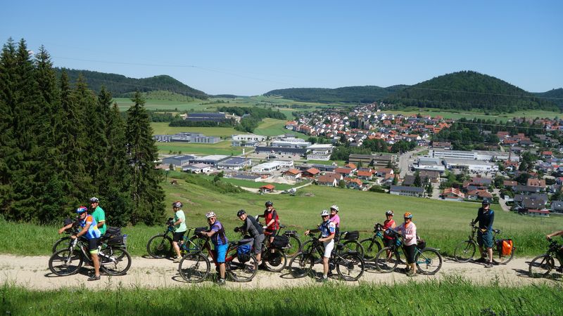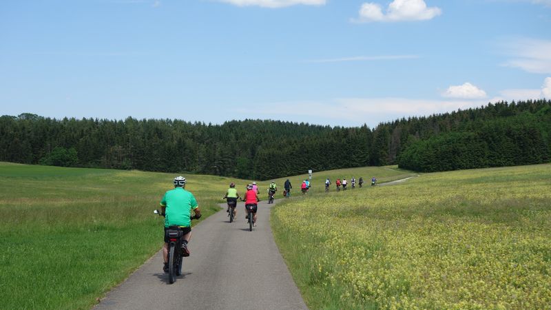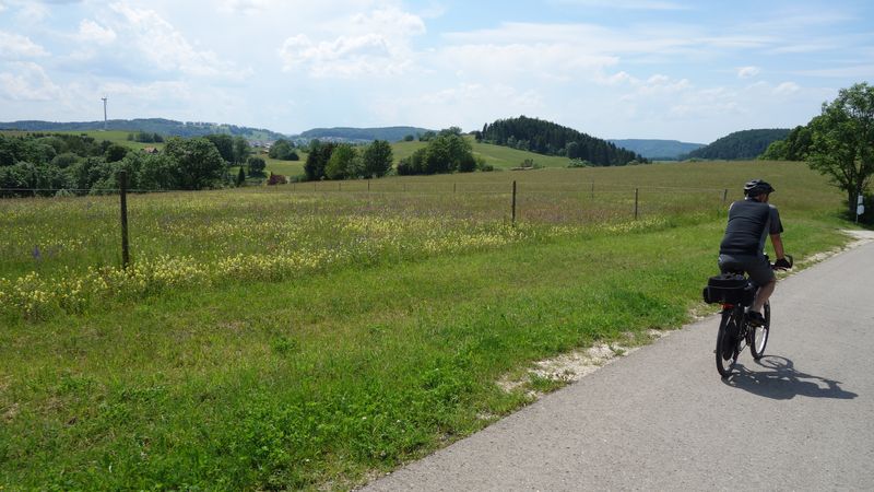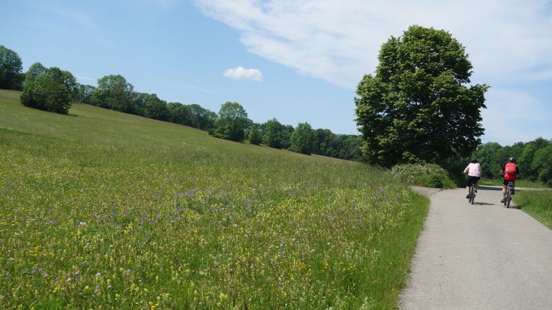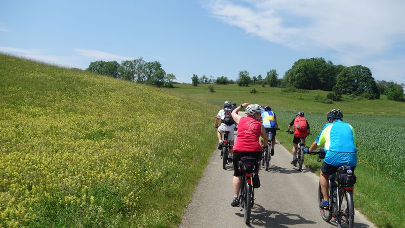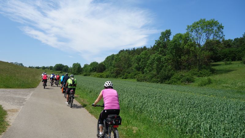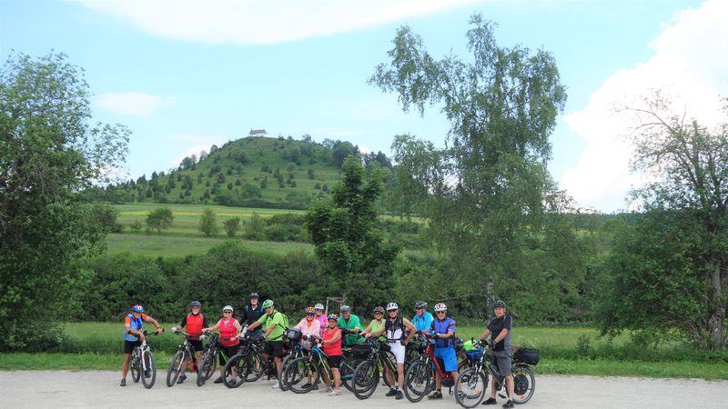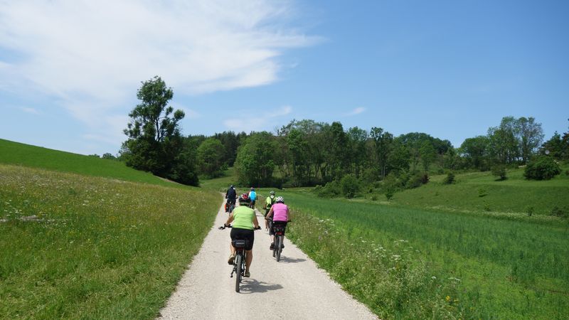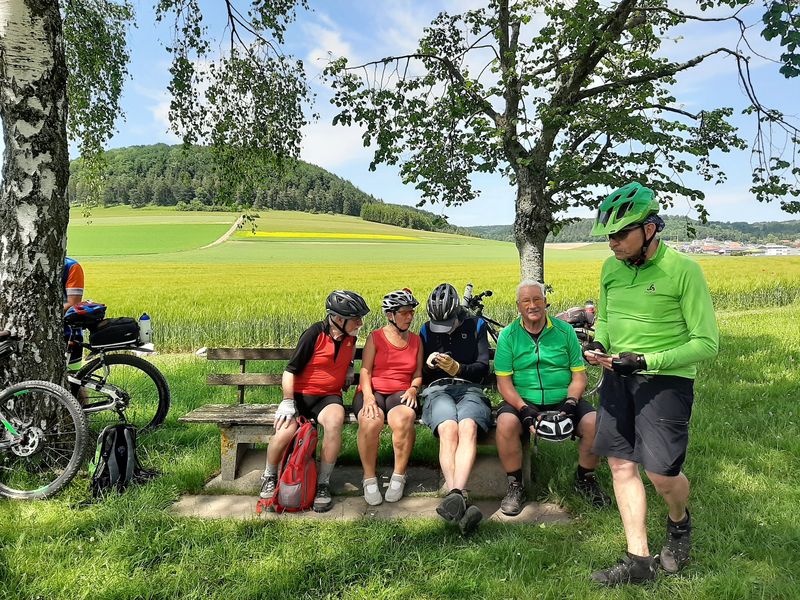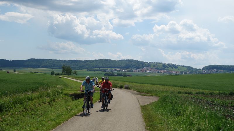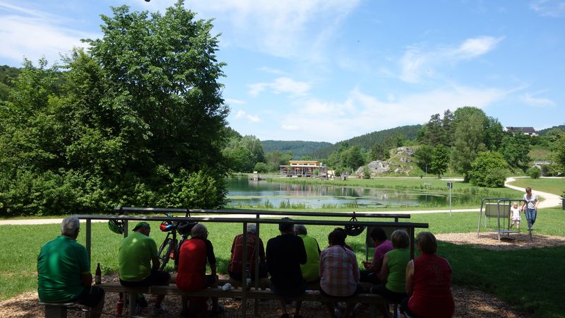 17 Teilnehmer trafen sich in Killer bei Hechingen. Mit angenehmer Steigung startete die Tour das Killertal hinauf nach und durch Burladingen. Über die Hochfläche ging es abwechslungsreich durch die typischen Trockentäler der Schwäbischen Alb hinüber nach Gauselfingen und Mariaberg. Im Laucherttal wurde an dem idyllisch gelegenen Lauchertsee bei Mägerkingen die Vesperpause eingelegt. Der Radweg durch das schöne Laucherttal führte weiter durch Hausen, Hörschwag und Stetten. In der weiten offene Landschaft bei Sonnenbühl beeindruckten die bunt blühenden Blumenwiesen. Der Körnbühl bei Salmendingen wurde zu Fuß über den Kreuzweg bestiegen. Hier von der Salmendinger Kapelle aus reichte der Blick weit ins Ländle. Nach Ringingen musste die Tour infolge eines Gewitter-Regengusses kurz unterbrochen werden. Danach war das Ziel in Killer nach 64 km mit 860 Höhenmeter Auffahrten bald wieder erreicht.