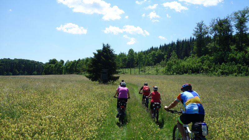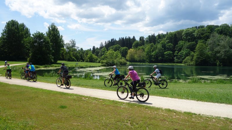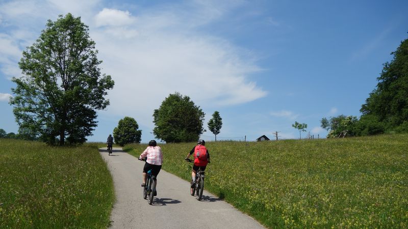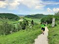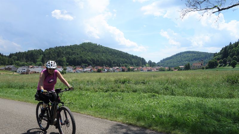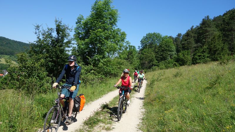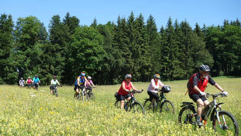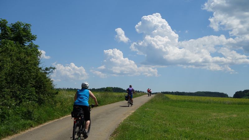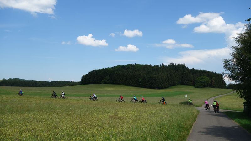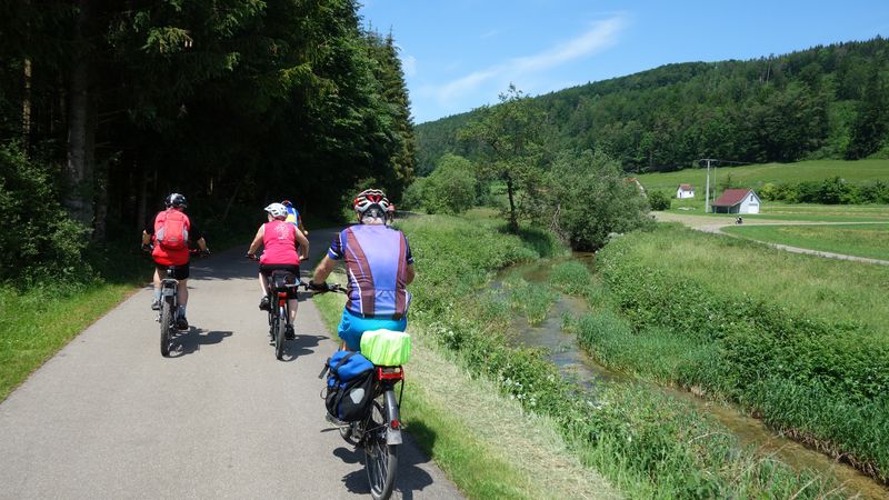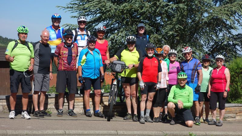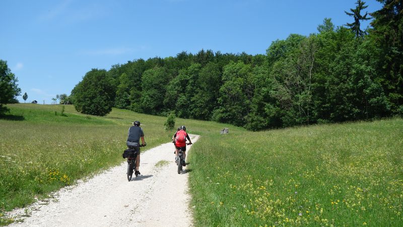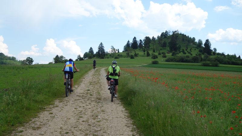 17 Teilnehmer trafen sich in Killer bei Hechingen. Mit angenehmer Steigung startete die Tour das Killertal hinauf nach und durch Burladingen. Über die Hochfläche ging es abwechslungsreich durch die typischen Trockentäler der Schwäbischen Alb hinüber nach Gauselfingen und Mariaberg. Im Laucherttal wurde an dem idyllisch gelegenen Lauchertsee bei Mägerkingen die Vesperpause eingelegt. Der Radweg durch das schöne Laucherttal führte weiter durch Hausen, Hörschwag und Stetten. In der weiten offene Landschaft bei Sonnenbühl beeindruckten die bunt blühenden Blumenwiesen. Der Körnbühl bei Salmendingen wurde zu Fuß über den Kreuzweg bestiegen. Hier von der Salmendinger Kapelle aus reichte der Blick weit ins Ländle. Nach Ringingen musste die Tour infolge eines Gewitter-Regengusses kurz unterbrochen werden. Danach war das Ziel in Killer nach 64 km mit 860 Höhenmeter Auffahrten bald wieder erreicht.